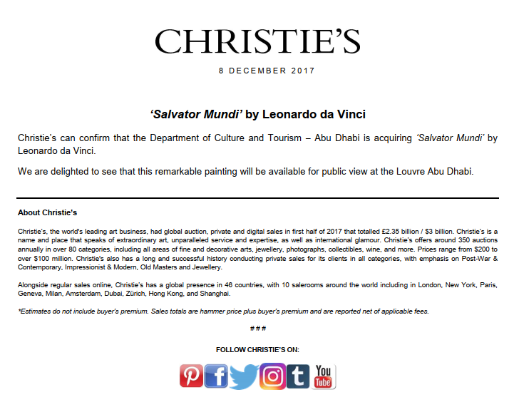 Traduction intĂ©grale de la dĂ©claration officielle de Christie’s publiĂ©e le 08 dĂ©cembre 2017 :