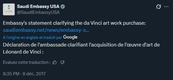 Voici Ă©galement une dĂ©claration officielle du DĂ©partement de la culture et du tourisme d’Abou Dhabi sur leur compte X, au sujet de l’acquisition du Salvator Mundi :