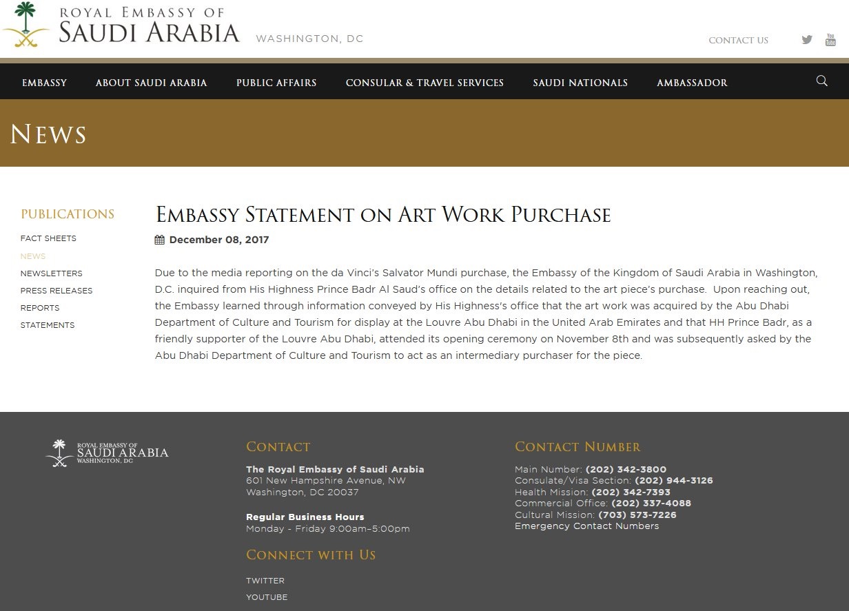 Déclaration de l’ambassade concernant l’acquisition d’une œuvre d’art | En raison des informations relayées par les médias au sujet de l’acquisition du Salvator Mundi de Léonard de Vinci, l’Ambassade du Royaume d’Arabie saoudite à Washington D.C. a sollicité le bureau de Son Altesse le prince Badr Al Saoud afin d’obtenir des précisions concernant l’achat de cette œuvre. Après avoir pris contact, l’Ambassade a appris, sur la base des informations communiquées par le bureau de Son Altesse, que l’œuvre avait été acquise par le Département de la culture et du tourisme d’Abou Dhabi pour être exposée au Louvre Abou Dhabi, aux Émirats arabes unis, et que Son Altesse le prince Badr, en tant que soutien ami du Louvre Abou Dhabi, avait assisté à sa cérémonie d’ouverture le 8 novembre. Il lui a ensuite été demandé par le Département de la culture et du tourisme d’Abou Dhabi d’agir en tant qu’acheteur intermédiaire pour cette pièce.