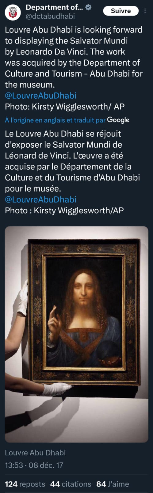 Voici Ă©galement une dĂ©claration officielle du DĂ©partement de la culture et du tourisme d’Abou Dhabi sur leur compte X, au sujet de l’acquisition du Salvator Mundi :